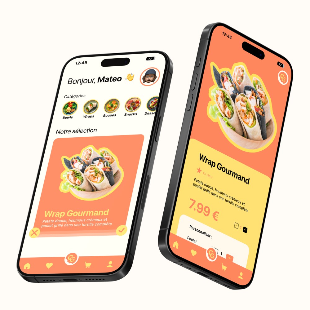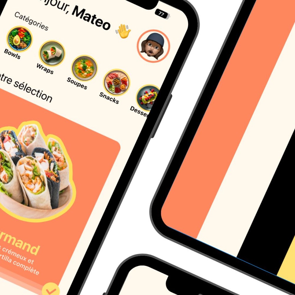L’enjeu principal de ce projet était de concevoir une application intuitive, adaptée aux usages mobiles, tout en respectant les codes du branding d’une marque foodtech moderne.